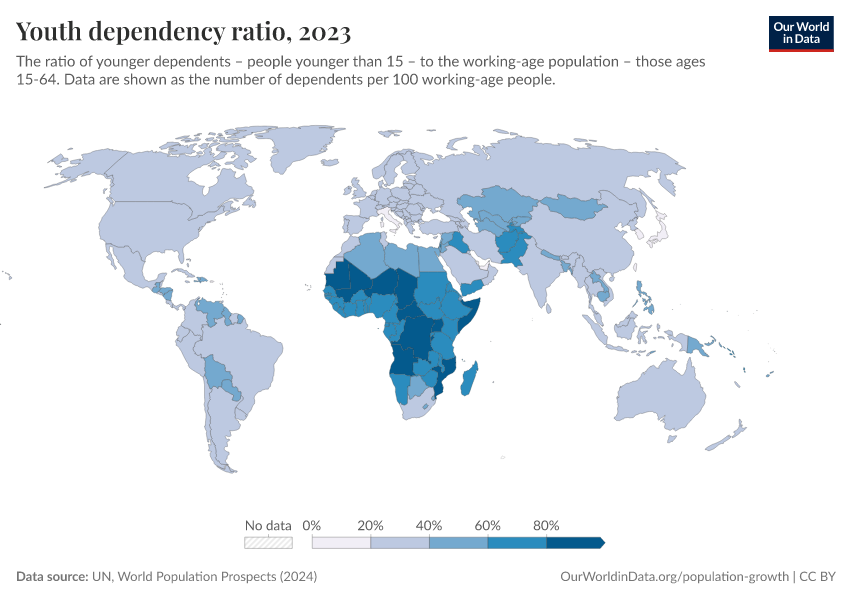 But we see big differences across the world. The ratio is much higher across many countries in Sub-Saharan Africa: several countries have a dependent population around the same size or larger than their working-age populations.