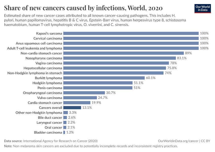 You can see that, for some cancers — such as Kaposi’s sarcoma, cervical cancer, T-cell leukemia and lymphoma, and non-cardia stomach cancer — it’s estimated that all, or almost all, cases are caused by pathogens.