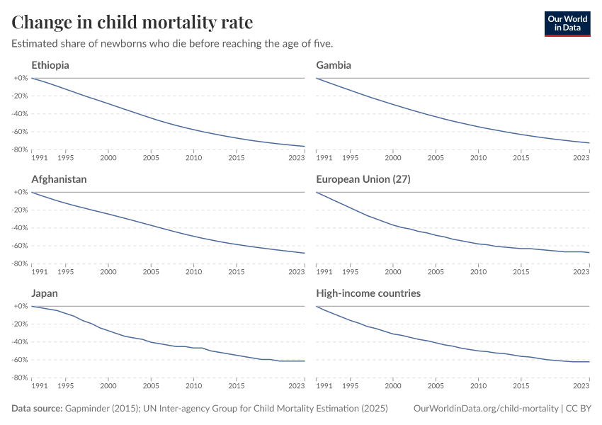 In the previous chart, progress in the EU looked a little underwhelming. But, in fact, rates have fallen by 69%. Even in Japan, one of the safest countries to be born in, child mortality rates have dropped by almost two-thirds. Those are not small reductions. Children are much less likely to die than they were in 1990.