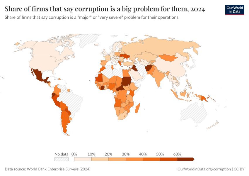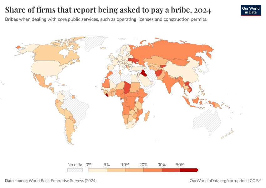 The map again shows that experiences vary widely. Fewer than 5% of firms in many countries report being asked for a bribe, but this number is much higher in some places: it’s more than 20% in dozens of countries, and in a few countries, it’s more than half.