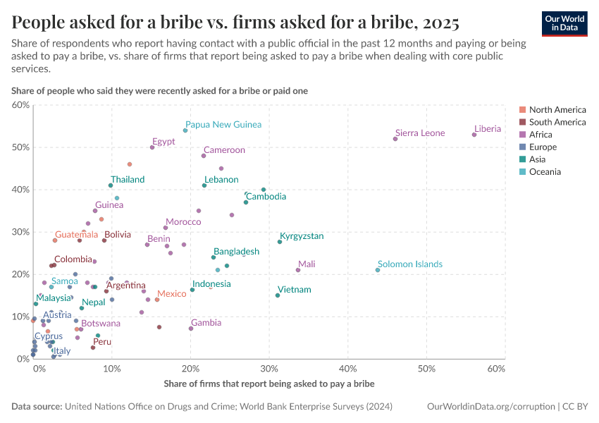 In many other places, however, bribery is far more common. In some countries, more than half of those interacting with public officials report being asked for a bribe or paying one.