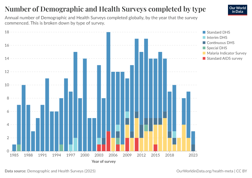 Saloni Dattani (2025) - “The Demographic and Health Surveys brought crucial data for more than 90 countries — without them, we risk darkness” Published online at OurWorldinData.org. Retrieved from: 'https://multi-dim-redirects-index.owid.pages.dev/demographic-health-surveys-risk' [Online Resource]BibTeX citation