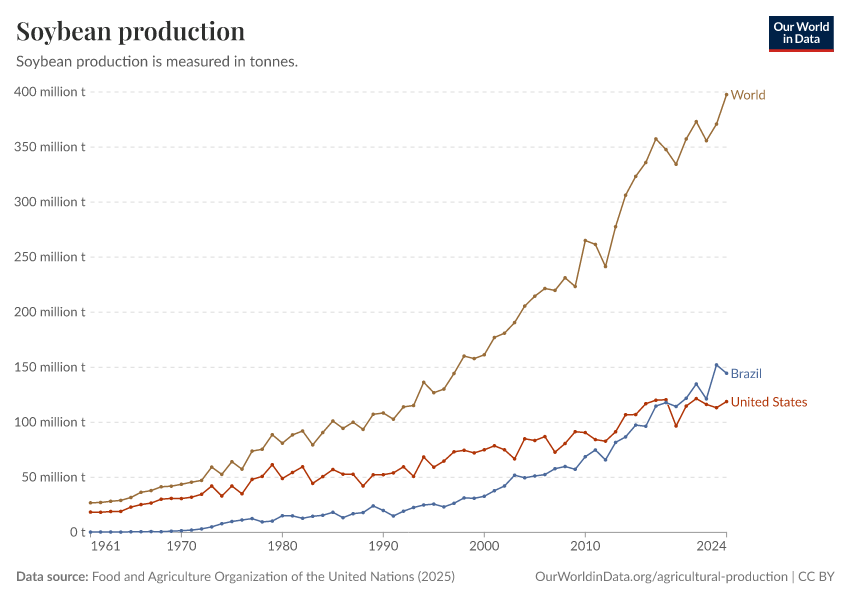 In the chart we see the change in soy production, yields, and area harvested. This tells us the percentage change in each of these variables relative to the first year shown. Here the starting year is 1961 but you can change this by adjusting the time slider at the bottom of the chart.