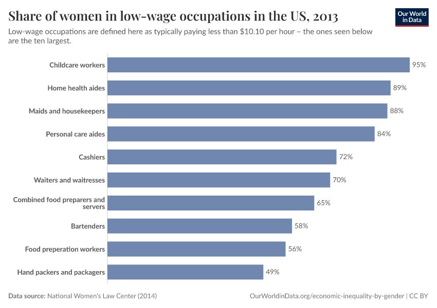 The fact that women in rich countries are overrepresented in the bottom of the income distribution goes together with the fact that working women in these countries are overrepresented in low-paying occupations. The chart shows this for the US.