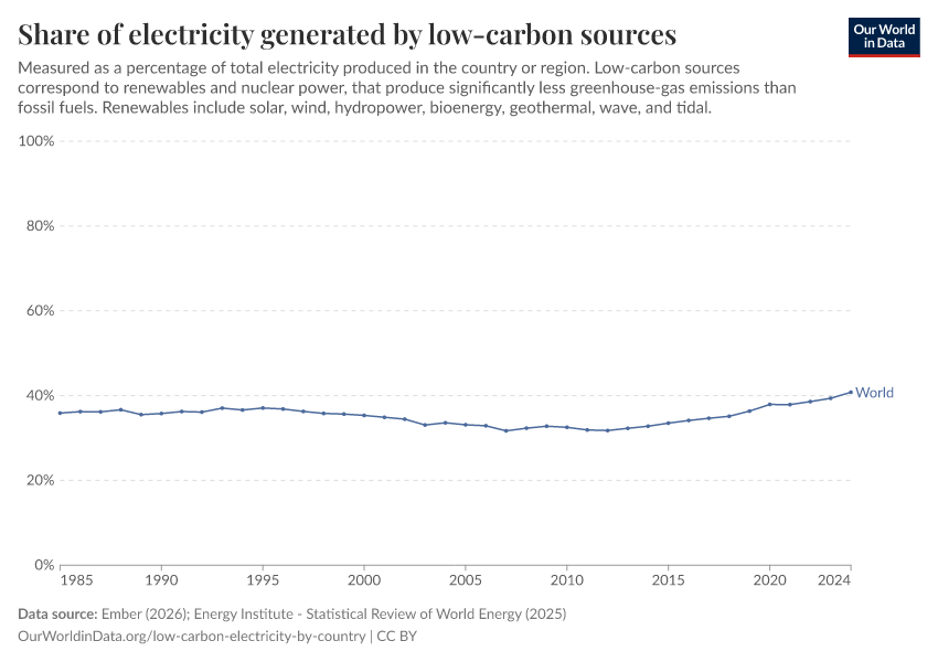 Over the past decades, the balance between fossil fuels and low-carbon electricity sources has remained relatively unchanged. A decline in nuclear energy has offset the progress made in renewables; nuclear declined almost as much as renewables gained.