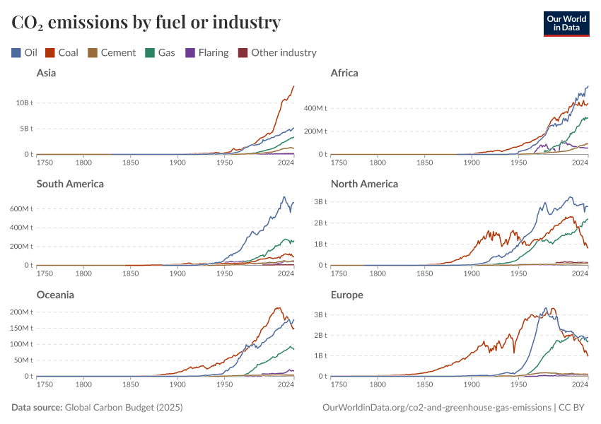 Carbon dioxide emissions associated with energy and industrial production can come from a range of fuel types. The contribution of each of these sources has changed significantly through time and still shows large differences by region. In the chart we see the absolute and relative contribution of CO2 emissions by source, differentiated between coal, gas, oil, flaring, and cement production.