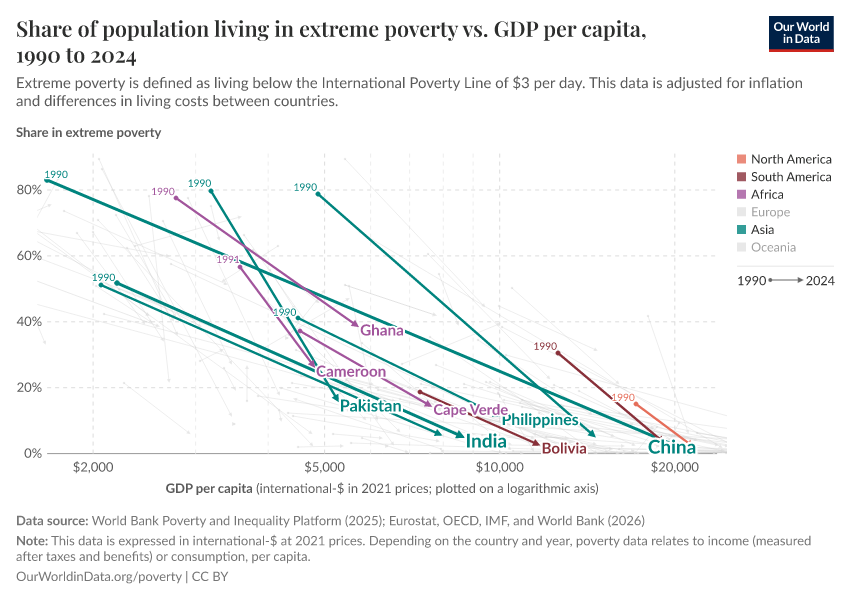 Extreme poverty declined in the last three decades because, back in the 1990s, the majority of the poorest people on the planet lived in countries that subsequently achieved very fast economic growth. In Indonesia and China, more than two-thirds of the population lived in extreme poverty. But these economies then grew rapidly, so that by today, the share has declined to less than 10%. Other large Asian countries — including India, Pakistan, Bangladesh, and the Philippines — also achieved strong growth, and as a consequence, the share living in extreme poverty declined rapidly. Much of the progress happened in Asia, but conditions in other regions improved too: the share living in extreme poverty also declined in Ghana, Cape Verde, Cameroon, Panama, Bolivia, Mexico, Brazil, and many other countries.