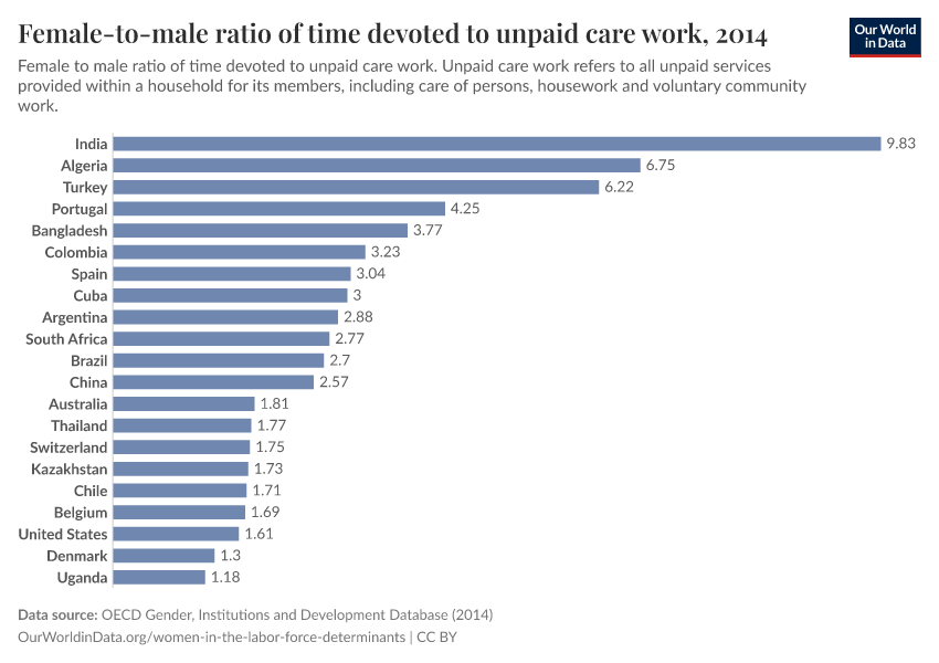 The bars show the female-to-male ratio of time devoted to unpaid services provided within the household, including care of persons, housework and voluntary community work.