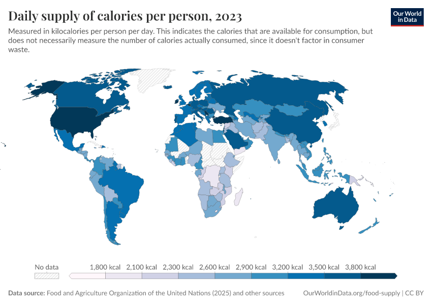 Max Roser, Hannah Ritchie, and Pablo Rosado (2013) - “Food Supply” Published online at OurWorldinData.org. Retrieved from: 'https://multi-dim-redirects-index.owid.pages.dev/food-supply' [Online Resource]BibTeX citation