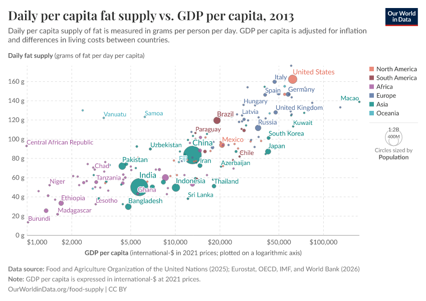 In this interactive map, we see the differences in how much fat each person gets every day in different countries.