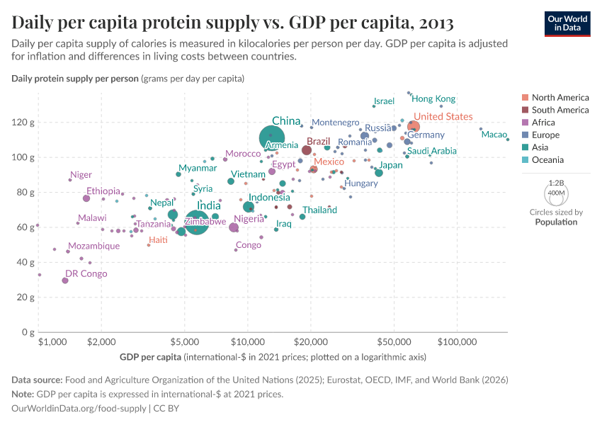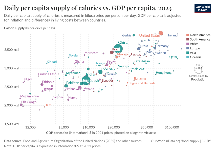 In the sub-sections below we have plotted the relationship between daily per capita food supply (in the form of calories, protein, and then fat) versus gross domestic product (GDP) per capita in 2011 international-$. Several countries selected across a range of income levels and global regions have been highlighted for comparison. For all three measures of food supply, we see a close correlation between per capita supply and prosperity. As we get richer, per capita supply tends to increase.
