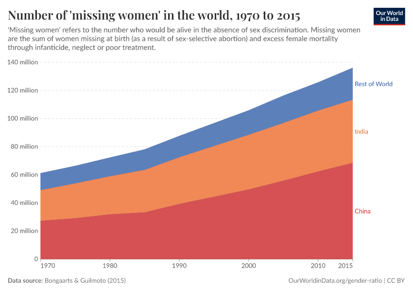 Bongaarts, J., & Guilmoto, C. Z. (2015). How many more missing women? Excess female mortality and prenatal sex selection, 1970–2050. Population and Development Review, 41(2), 241-269.
