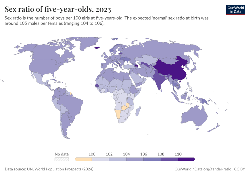 Most countries have a sex ratio at birth around the expected range of 105 boys born for every 100 girls.
