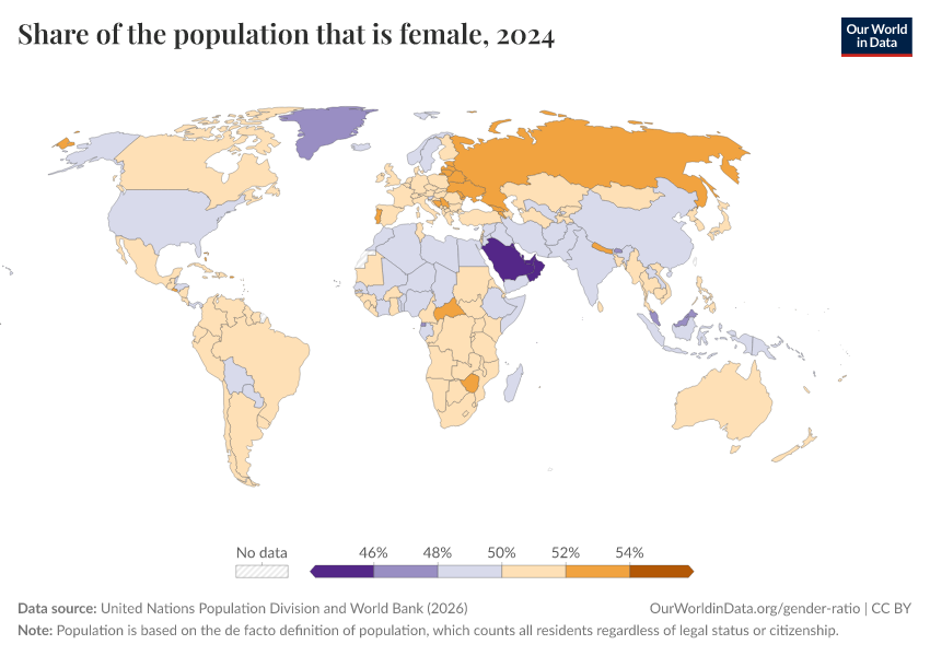 Countries over 50 percent (shown in orange) have a higher female population, while those below 50 percent (shown in purple) have a higher male population.