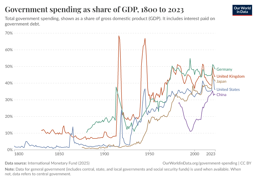 The visualization shows the evolution of government spending as a share of Gross Domestic Product (GDP), for a selection of countries over the last century.