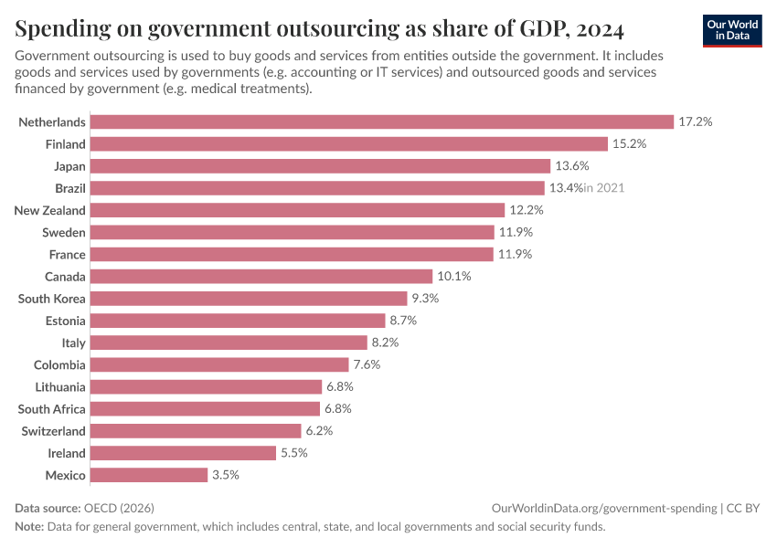 As we can see, governments in many high-income countries spend substantial resources via outsourcing.