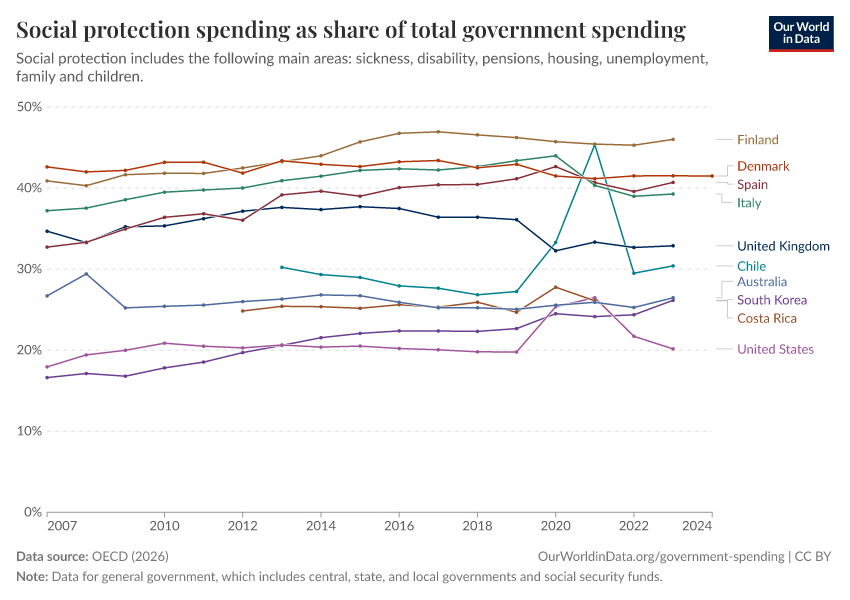 The chart here shows spending on social protection as a share of total government spending for OECD countries. As we can see, there are also large differences across OECD countries themselves.