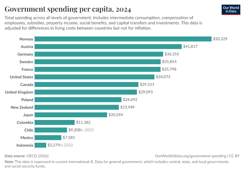 The chart shows total public spending per person across all levels of government in OECD countries.