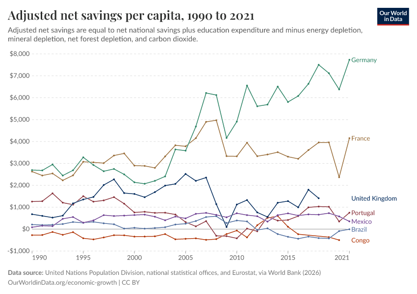 United Nations Population Division, national statistical offices, and Eurostat, via World Bank (2025) – processed by Our World in Data. “Adjusted net savings per capita” [dataset]. United Nations Population Division, national statistical offices, and Eurostat, via World Bank, “World Development Indicators 122” [original data]. Retrieved January 8, 2026 from https://multi-dim-redirects-index.owid.pages.dev/grapher/adjusted-net-savings-per-person