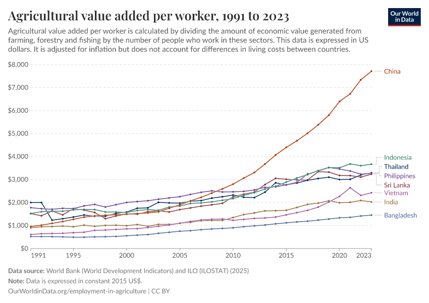 World Bank (World Development Indicators) and ILO (ILOSTAT) (2025) – processed by Our World in Data. “Agricultural value added per worker” [dataset]. World Bank (World Development Indicators) and ILO (ILOSTAT), “World Development Indicators 122” [original data]. Retrieved January 8, 2026 from https://multi-dim-redirects-index.owid.pages.dev/grapher/agriculture-value-added-per-worker-wdi