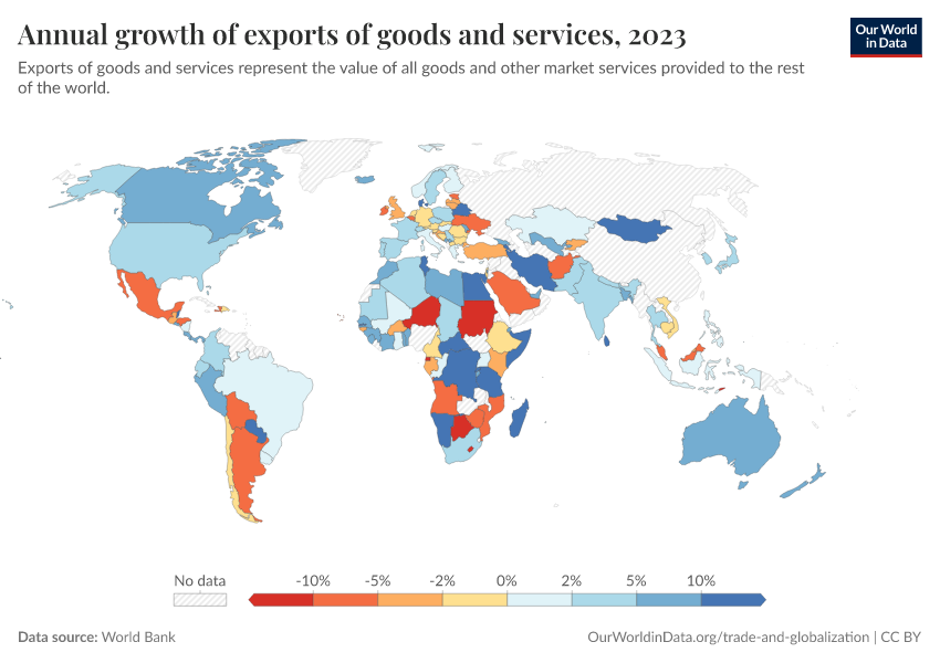 “Data Page: Annual growth of exports of goods and services”. Our World in Data (2026). Data adapted from World Bank. Retrieved from https://multi-dim-redirects-index.owid.pages.dev/grapher/annual-growth-of-exports-of-goods-and-services [online resource]How to cite this data