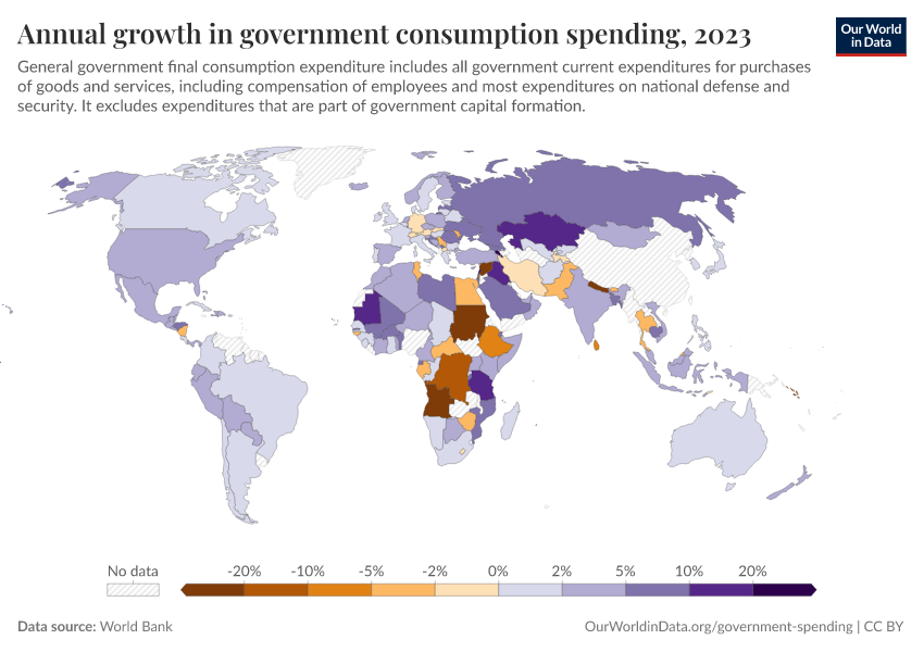 “Data Page: Annual growth in government consumption spending”. Our World in Data (2026). Data adapted from World Bank. Retrieved from https://multi-dim-redirects-index.owid.pages.dev/grapher/annual-growth-of-general-government-final-consumption-expenditure [online resource]How to cite this data