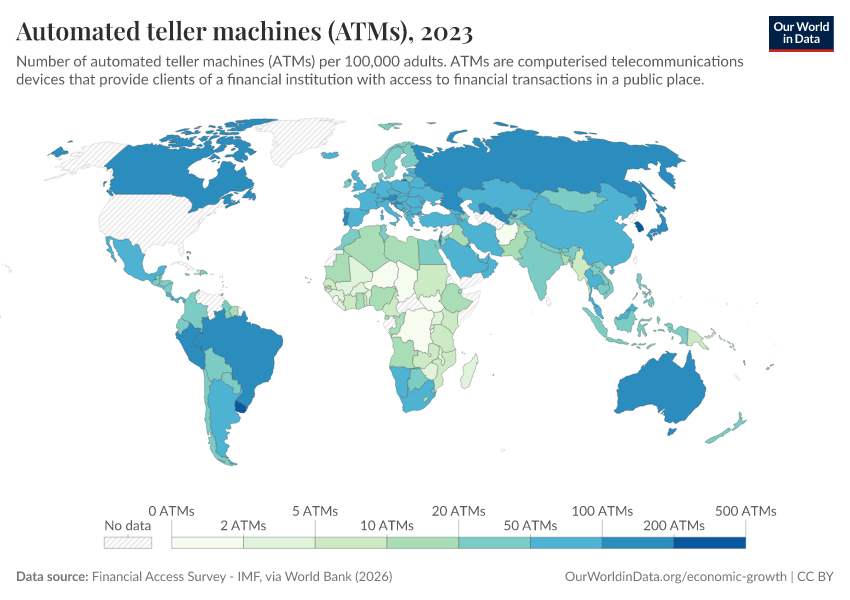 “Data Page: Automated teller machines (ATMs)”. Our World in Data (2026). Data adapted from Financial Access Survey - IMF, via World Bank. Retrieved from https://multi-dim-redirects-index.owid.pages.dev/grapher/automated-teller-machines-atms-per-100000-adults [online resource]How to cite this data