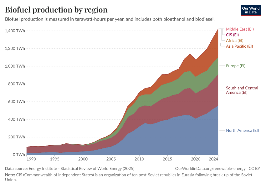 Energy Institute - Statistical Review of World Energy (2025) – with major processing by Our World in Data. “Biofuels production” [dataset]. Energy Institute, “Statistical Review of World Energy” [original data]. Retrieved January 8, 2026 from https://multi-dim-redirects-index.owid.pages.dev/grapher/biofuels-production-by-region