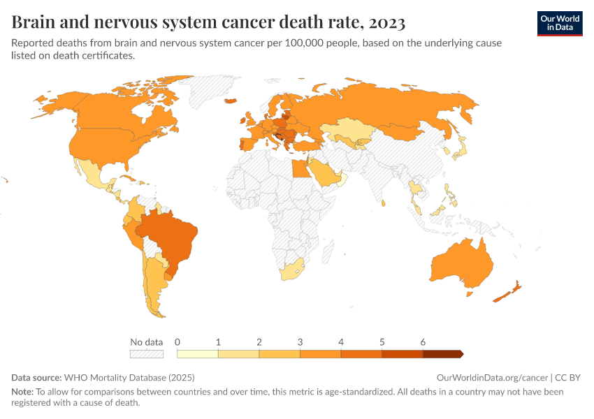 WHO Mortality Database (2025) – with minor processing by Our World in Data. “Brain and nervous system cancer death rate” [dataset]. WHO Mortality Database, “WHO Mortality Database” [original data]. Retrieved January 8, 2026 from https://multi-dim-redirects-index.owid.pages.dev/grapher/brain-and-nervous-system-cancer-death-rate