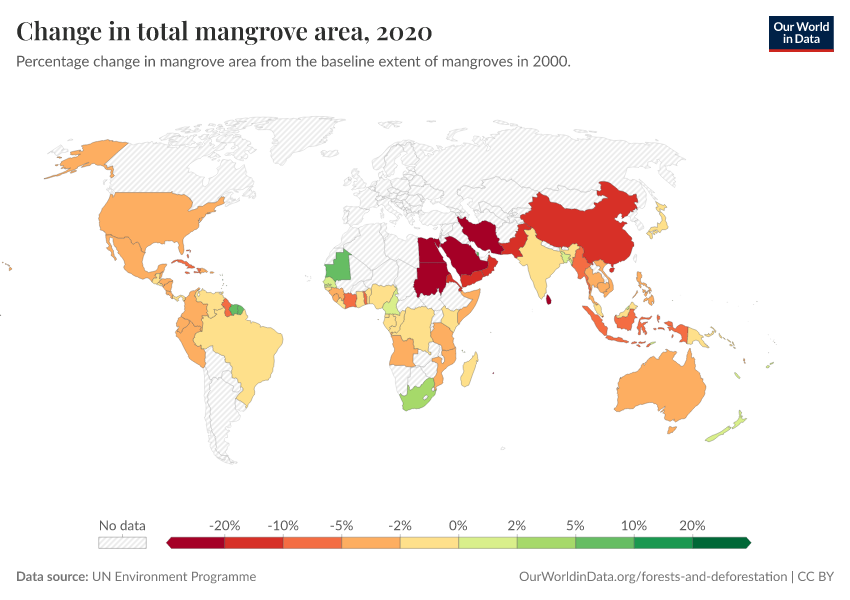 “Data Page: Change in total mangrove area”. Our World in Data (2026). Data adapted from UN Environment Programme. Retrieved from https://multi-dim-redirects-index.owid.pages.dev/grapher/change-in-total-mangrove-area [online resource]How to cite this data