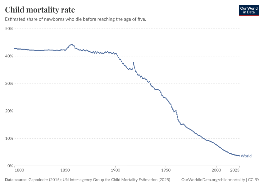 Gapminder (2015); UN Inter-agency Group for Child Mortality Estimation (2025) – processed by Our World in Data. “Child mortality rate – Gapminder; UN IGME – Long-run data” [dataset]. United Nations Inter-agency Group for Child Mortality Estimation, “United Nations Inter-agency Group for Child Mortality Estimation”; Gapminder, “Child mortality rate under age five v7”; Gapminder based on UN IGME & UN WPP, “Under-five Mortality v11”; Various sources, “Population” [original data]. Retrieved January 8, 2026 from https://multi-dim-redirects-index.owid.pages.dev/grapher/child-mortality