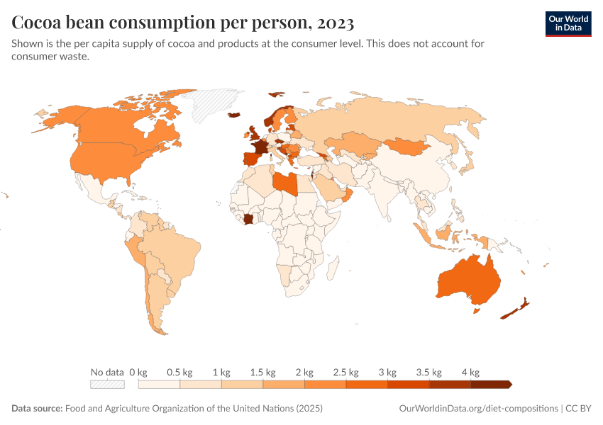 Food and Agriculture Organization of the United Nations (2024) – processed by Our World in Data. “Yearly per capita supply of cocoa beans” [dataset]. Food and Agriculture Organization of the United Nations, “Food Balances: Food Balances (-2013, old methodology and population)”; Food and Agriculture Organization of the United Nations, “Food Balances: Food Balances (2010-)” [original data]. Retrieved January 8, 2026 from https://multi-dim-redirects-index.owid.pages.dev/grapher/chocolate-consumption-per-person