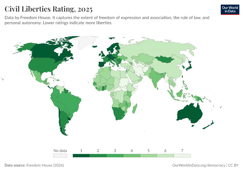 Freedom House (2025) – processed by Our World in Data. “Civil liberties rating” [dataset]. Freedom House, “Freedom in the World” [original data]. Retrieved January 8, 2026 from https://multi-dim-redirects-index.owid.pages.dev/grapher/civil-liberties-rating-fh