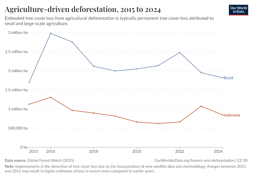 “Data Page: Agriculture-driven deforestation”, part of the following publication: Hannah Ritchie, Fiona Spooner, and Max Roser (2021) - “Forests and Deforestation”. Data adapted from Global Forest Watch. Retrieved from https://multi-dim-redirects-index.owid.pages.dev/grapher/commodity-driven-deforestation [online resource]How to cite this data
