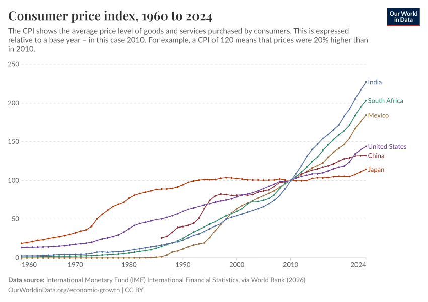 “Data Page: Consumer price index”. Our World in Data (2026). Data adapted from International Monetary Fund (IMF) International Financial Statistics, via World Bank. Retrieved from https://multi-dim-redirects-index.owid.pages.dev/grapher/consumer-price-index [online resource]How to cite this data