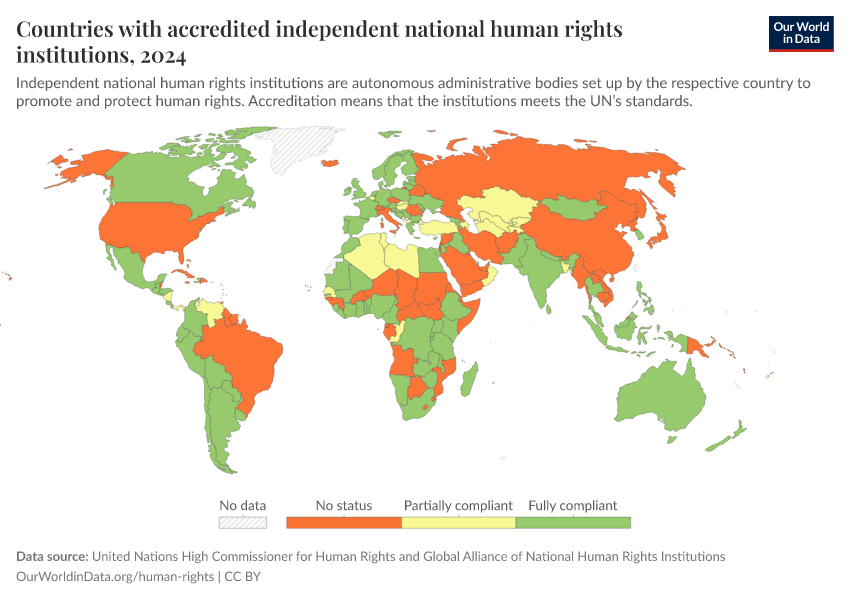 United Nations High Commissioner for Human Rights and Global Alliance of National Human Rights Institutions – processed by Our World in Data. “Countries with accredited independent national human rights institutions” [dataset]. United Nations High Commissioner for Human Rights and Global Alliance of National Human Rights Institutions, “Source: The Office of the United Nations High Commissioner for Human Rights (OHCHR) in collaboration with Global Alliance of National Human Rights Institutions (GANHRI).” [original data]. Retrieved January 8, 2026 from https://multi-dim-redirects-index.owid.pages.dev/grapher/countries-with-independent-national-human-rights-institution
