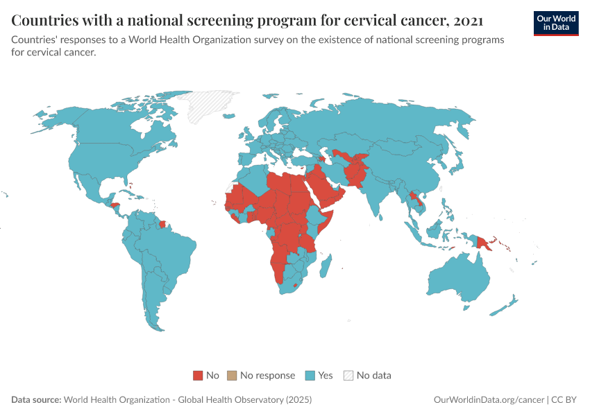 “Data Page: Countries with a national screening program for cervical cancer”. Our World in Data (2026). Data adapted from World Health Organization. Retrieved from https://multi-dim-redirects-index.owid.pages.dev/grapher/countries-with-national-cervical-cancer-screening-program [online resource]How to cite this data