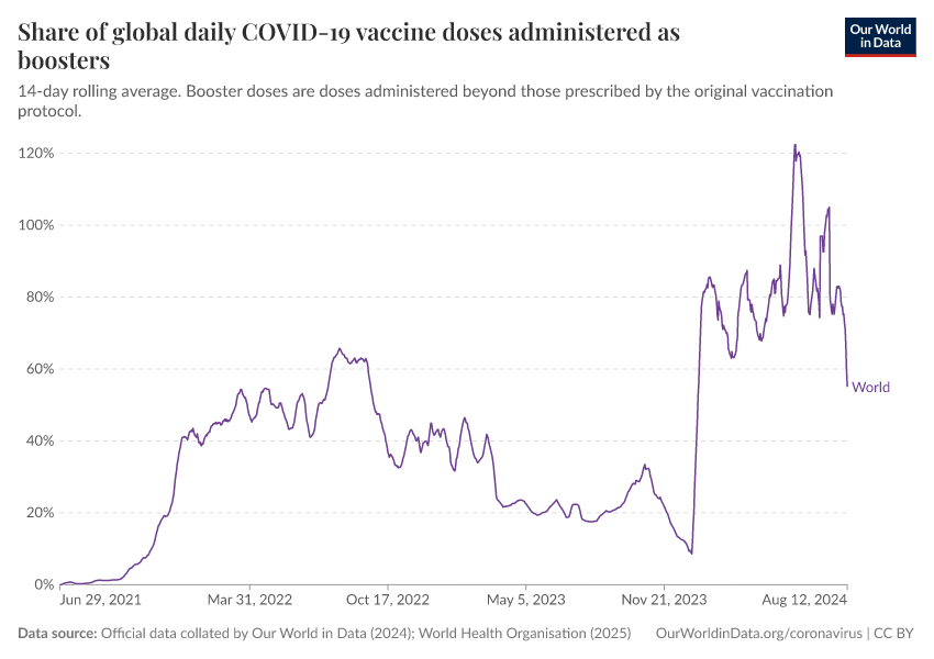 Official data collated by Our World in Data (2024); World Health Organisation (2025) – with major processing by Our World in Data. “Share of global daily COVID-19 vaccine doses administered as boosters” [dataset]. Official data collated by Our World in Data, “COVID-19, vaccinations”; World Health Organisation, “COVID-19, vaccinations (WHO)” [original data]. Retrieved January 8, 2026 from https://multi-dim-redirects-index.owid.pages.dev/grapher/covid-vaccine-share-boosters