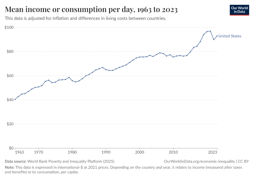 World Bank Poverty and Inequality Platform (2025) – with major processing by Our World in Data. “Mean income or consumption per day – World Bank” [dataset]. World Bank Poverty and Inequality Platform, “World Bank Poverty and Inequality Platform (PIP) 20250930_2021, 20250930_2017” [original data]. Retrieved January 8, 2026 from https://multi-dim-redirects-index.owid.pages.dev/grapher/daily-mean-income