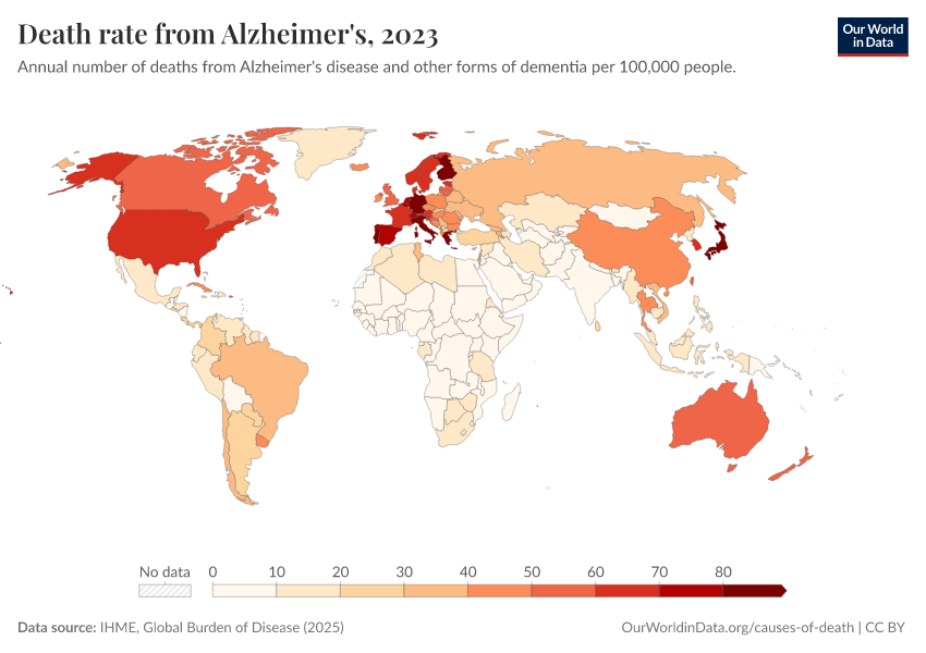IHME, Global Burden of Disease (2024) – with minor processing by Our World in Data. “Death rate from Alzheimer's” [dataset]. IHME, Global Burden of Disease, “Global Burden of Disease - Deaths and DALYs” [original data]. Retrieved January 8, 2026 from https://multi-dim-redirects-index.owid.pages.dev/grapher/death-rate-from-alzheimers-other-dementias-gbd