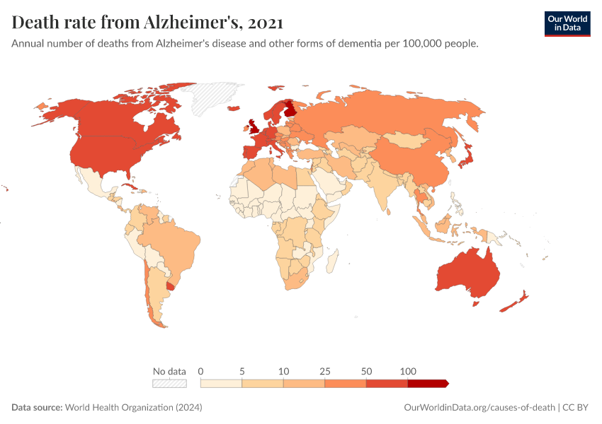 World Health Organization (2024) – with major processing by Our World in Data. “Death rate from Alzheimer's” [dataset]. World Health Organization, “Global Health Estimates” [original data]. Retrieved January 8, 2026 from https://multi-dim-redirects-index.owid.pages.dev/grapher/death-rate-from-alzheimers-other-dementias-ghe