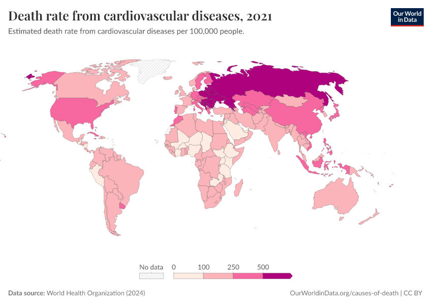 World Health Organization (2024) – with major processing by Our World in Data. “Death rate from cardiovascular diseases” [dataset]. World Health Organization, “Global Health Estimates” [original data]. Retrieved January 8, 2026 from https://multi-dim-redirects-index.owid.pages.dev/grapher/death-rate-from-cardiovascular-disease-ghe