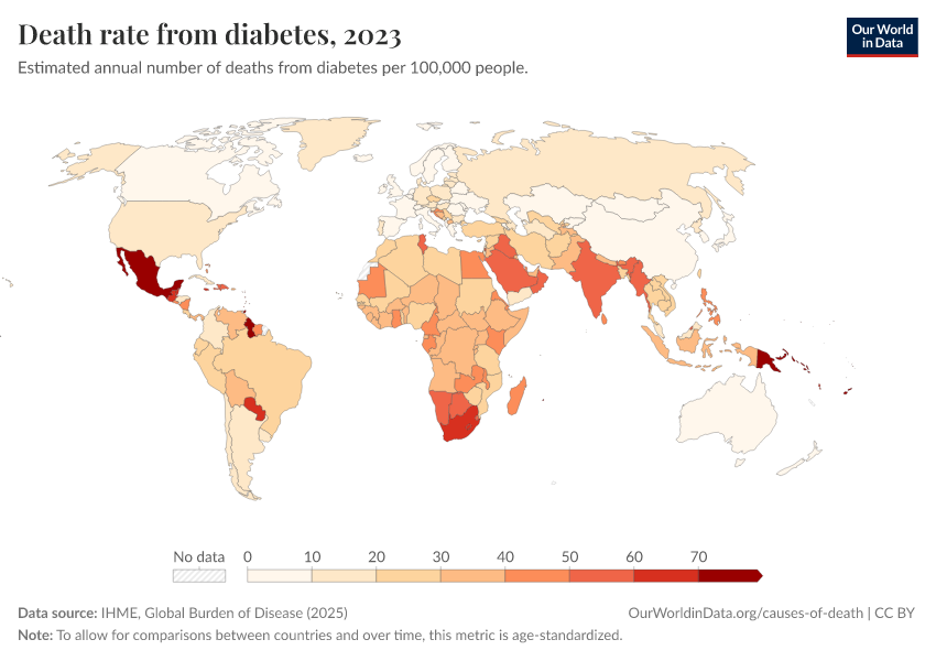 “Data Page: Death rate from diabetes”, part of the following publication: Esteban Ortiz-Ospina and Max Roser (2016) - “Global Health”. Data adapted from IHME, Global Burden of Disease. Retrieved from https://multi-dim-redirects-index.owid.pages.dev/grapher/death-rate-from-diabetes [online resource]How to cite this data
