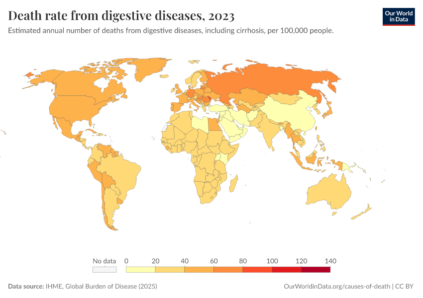 IHME, Global Burden of Disease (2024) – with minor processing by Our World in Data. “Death rate from digestive diseases” [dataset]. IHME, Global Burden of Disease, “Global Burden of Disease - Deaths and DALYs” [original data]. Retrieved January 8, 2026 from https://multi-dim-redirects-index.owid.pages.dev/grapher/death-rate-from-digestive-diseases-gbd