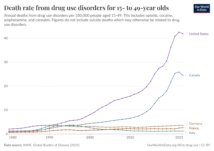 IHME, Global Burden of Disease (2024) – with minor processing by Our World in Data. “Death rate from drug use disorders for 15- to 49-year olds” [dataset]. IHME, Global Burden of Disease, “Global Burden of Disease - Deaths and DALYs” [original data]. Retrieved January 8, 2026 from https://multi-dim-redirects-index.owid.pages.dev/grapher/death-rate-from-drug-use-disorders-for-15--to-49-year-olds