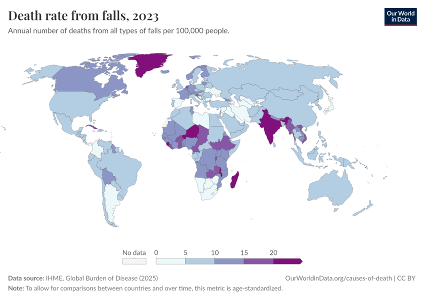 “Data Page: Death rate from falls”, part of the following publication: Esteban Ortiz-Ospina and Max Roser (2016) - “Global Health”. Data adapted from IHME, Global Burden of Disease. Retrieved from https://multi-dim-redirects-index.owid.pages.dev/grapher/death-rate-from-falls-gbd [online resource]How to cite this data