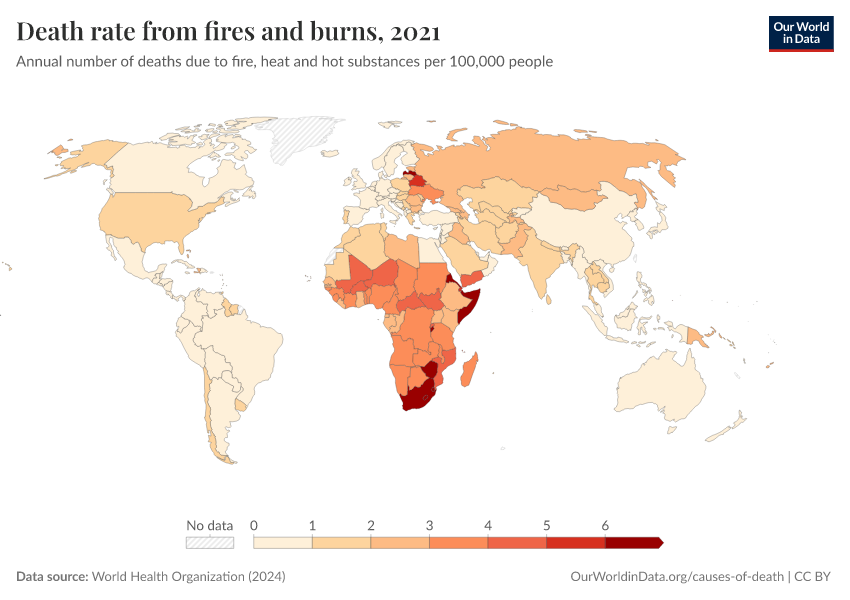 World Health Organization (2024) – with major processing by Our World in Data. “Death rate from fires and burns” [dataset]. World Health Organization, “Global Health Estimates” [original data]. Retrieved January 8, 2026 from https://multi-dim-redirects-index.owid.pages.dev/grapher/death-rate-from-fires-and-burns-who