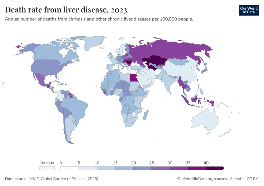 IHME, Global Burden of Disease (2024) – with minor processing by Our World in Data. “Death rate from liver disease” [dataset]. IHME, Global Burden of Disease, “Global Burden of Disease - Deaths and DALYs” [original data]. Retrieved January 8, 2026 from https://multi-dim-redirects-index.owid.pages.dev/grapher/death-rate-from-liver-disease-gbd