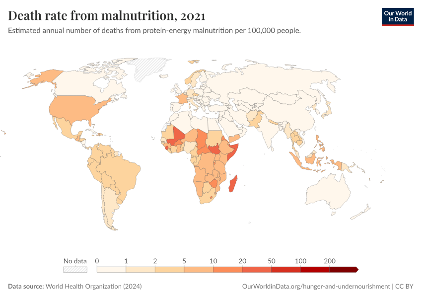 World Health Organization (2024) – with major processing by Our World in Data. “Death rate from malnutrition” [dataset]. World Health Organization, “Global Health Estimates” [original data]. Retrieved January 8, 2026 from https://multi-dim-redirects-index.owid.pages.dev/grapher/death-rate-from-malnutrition-ghe