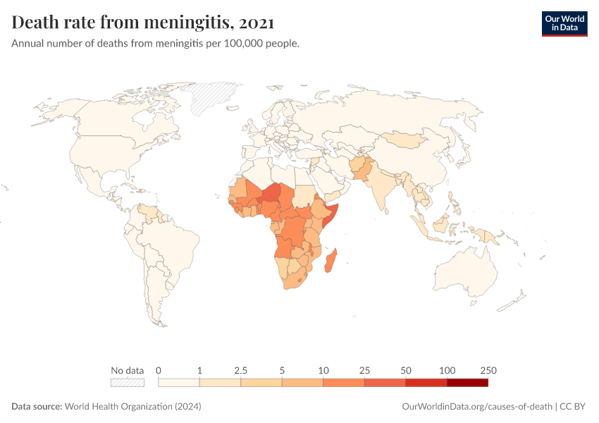 World Health Organization (2024) – with major processing by Our World in Data. “Death rate from meningitis” [dataset]. World Health Organization, “Global Health Estimates” [original data]. Retrieved January 8, 2026 from https://multi-dim-redirects-index.owid.pages.dev/grapher/death-rate-from-meningitis-who